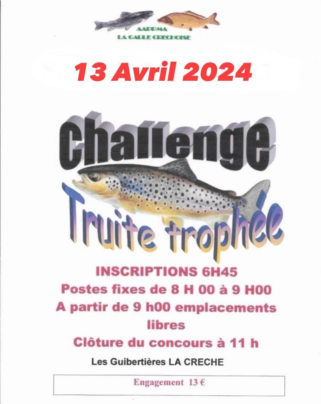 Le challenge truite trophée du 16 Mars 2024, est reporté au 13 Avril 2024 pour cause météorologiques et de sécurité. Le lieu et l'horaire ne changes pas.